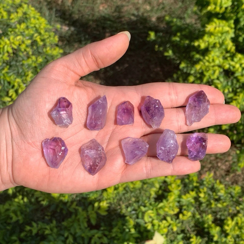 Este kit contém 10 unidades de Ametista bruta, com aproximadamente 1,5 cm cada. São peças selecionadas de alta qualidade, com coloração roxa intensa e brilho vítreo, muito acima do padrão normalmente encontrado no mercado.