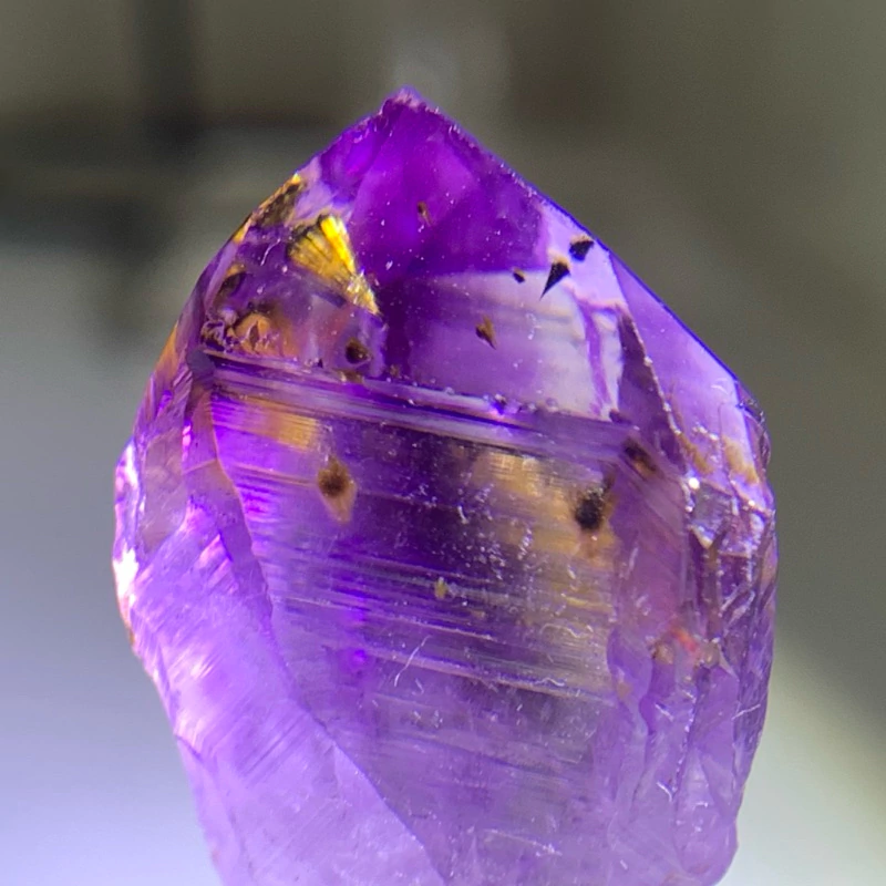 Diferente da ametista chevron, que apresenta faixas brancas de quartzo formando padrões geométricos, a cacoxenita autêntica se destaca pelos inclusões douradas em forma de agulhas ou cones, trazendo uma vibração única de expansão espiritual e conexão com planos superiores.