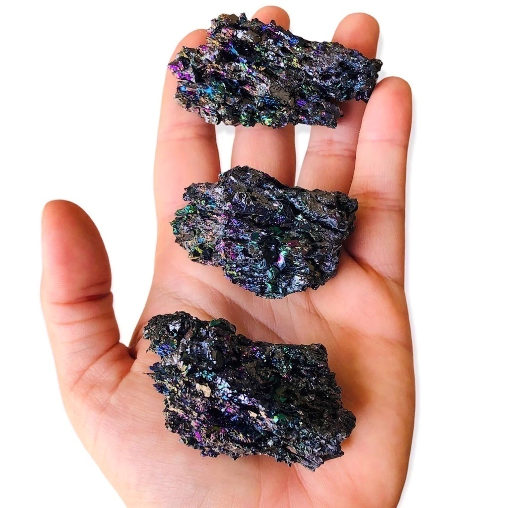O Silício Arco-Irís possui uma coloração singular e muito bela. Seus cristais possuem um brilho metálico que variam de acordo com a luz indo de azul, roxo, verde, rosa até dourado em um fundo negro.